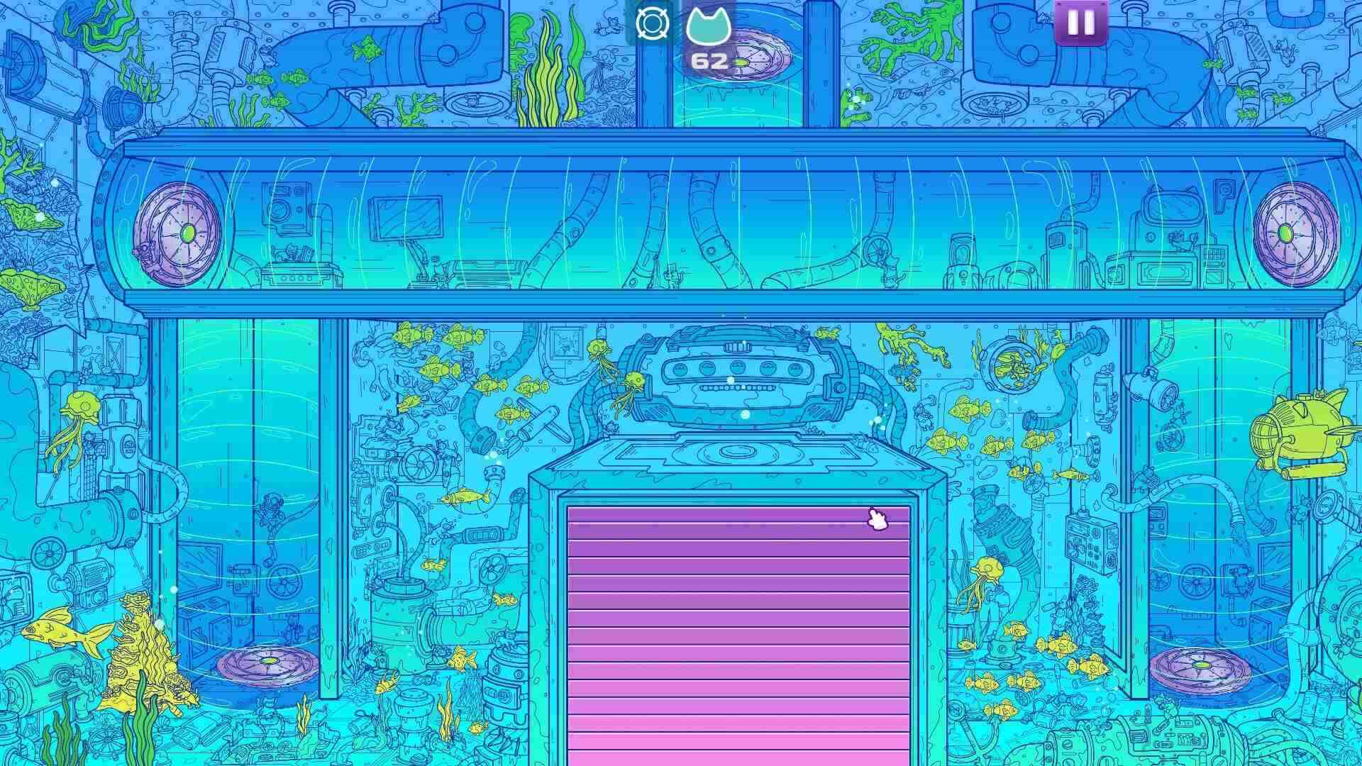 Donde realmente destaca el juego es en su apartado audiovisual. El estilo artístico apuesta por un acabado dibujado a mano en el que los gatos se mimetizan con el entorno de forma muy ingeniosa. Al hacer clic sobre ellos, se colorean y destacan claramente frente al fondo, lo que genera una sensación muy satisfactoria. Cada bioma tiene su propia identidad visual, con paletas de colores bien diferenciadas; por ejemplo, en zonas submarinas predominan los tonos azules, lo que ayuda a reforzar la ambientación.
