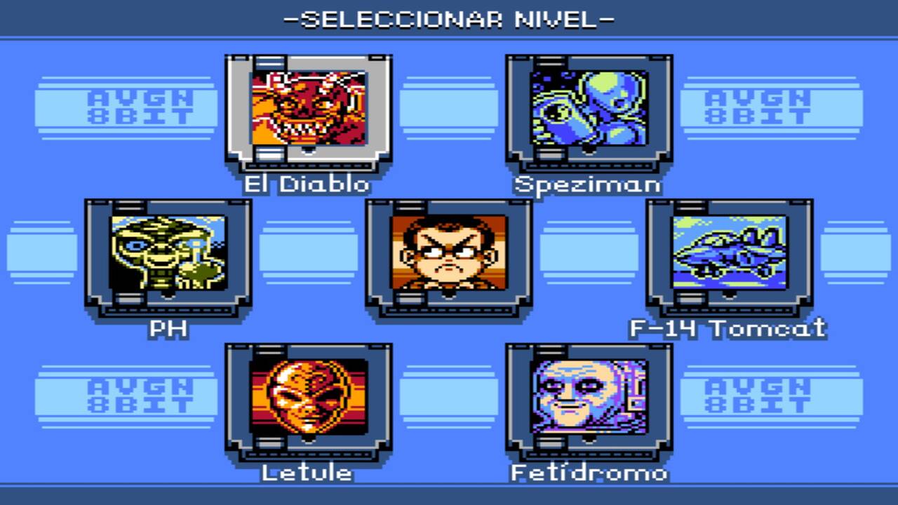Tras una delirante intro que dejo que el jugador descubra -TRUCOOOOOOOOOOOO, salid de ella, poned en las opciones el idioma español, salid del juego, y al entrar la veréis con un trabajo en los textos en español muy bueno-, que es precisamente otro programa al uso del AVGN, ya podemos ver en la pantalla de selección de arriba no solo esos homenajes cariñosos a la NES en forma de gameplay y referencias, sino al mundo creado por el Angry Video Game Nerd durante más de dos décadas.