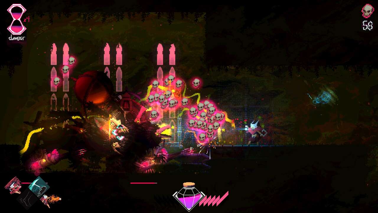 La diferencia respecto a Hades, o de manera más cercana, Astral Ascent, es que aquí sigue habiendo también componente roguelike y procedural, sin embargo los caminos, salas y mapa son ‘estables’. Se sigue usando la estructura de intercalar secciones de acción y plataformas con salas con personajes aleatorios cuyas conversaciones e historias avanzan cuanto más interactuamos y les conocemos. Pero cada sala que encontramos es fija, no generada al vuelo. Ah, pero tenemos añadido un sistema de «peligro».