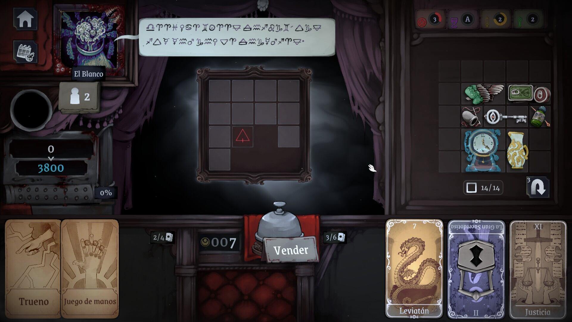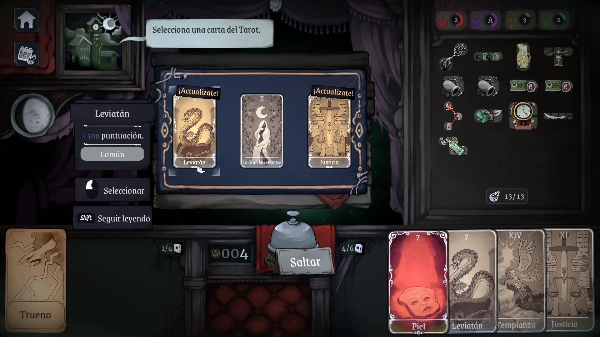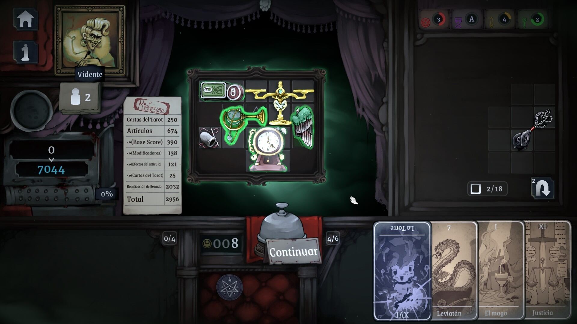 Ahora bien, para llegar a la puntuación requerida podemos usar los arcanos del tarot, los cuales nos darán una serie de modificadores para ayudarnos a alcanzar la puntuación necesaria para poder seguir vivos. Estas cartas pueden ir mejorándose con el -poco- dinero que obtendremos al finalizar el día, pero como también podremos comprar diferentes objetos tendremos que elegir bien qué nos interesa más: si mejorar ese bonificador para que en lugar de 500 nos sume 1000 al multiplicador o si queremos un nuevo objeto para tener más mercancía y así poder cubrir nuestra deuda.