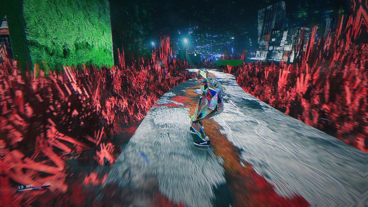 Esos mundos, esas capas del infierno, ese diseño visual bien poderoso… hay músculo para mover el juego que redunda en su formidable apartado artístico. No por nada, Skate Story aparece solo en sistemas de nueva generación. Pues todo esto no valdría la mitad sin la increíble parte musical, imposible de transmitir con todo lo explicado, y que solo puedo intentar espejar a cosas como el Rez de Tetsuya Mizuguchi y SEGA, y los inabarcables ejemplos de esta combinación durante tantos años. No es para nada un genial acompañamiento y potenciador, es parte necesaria de la experiencia de Skate Story.