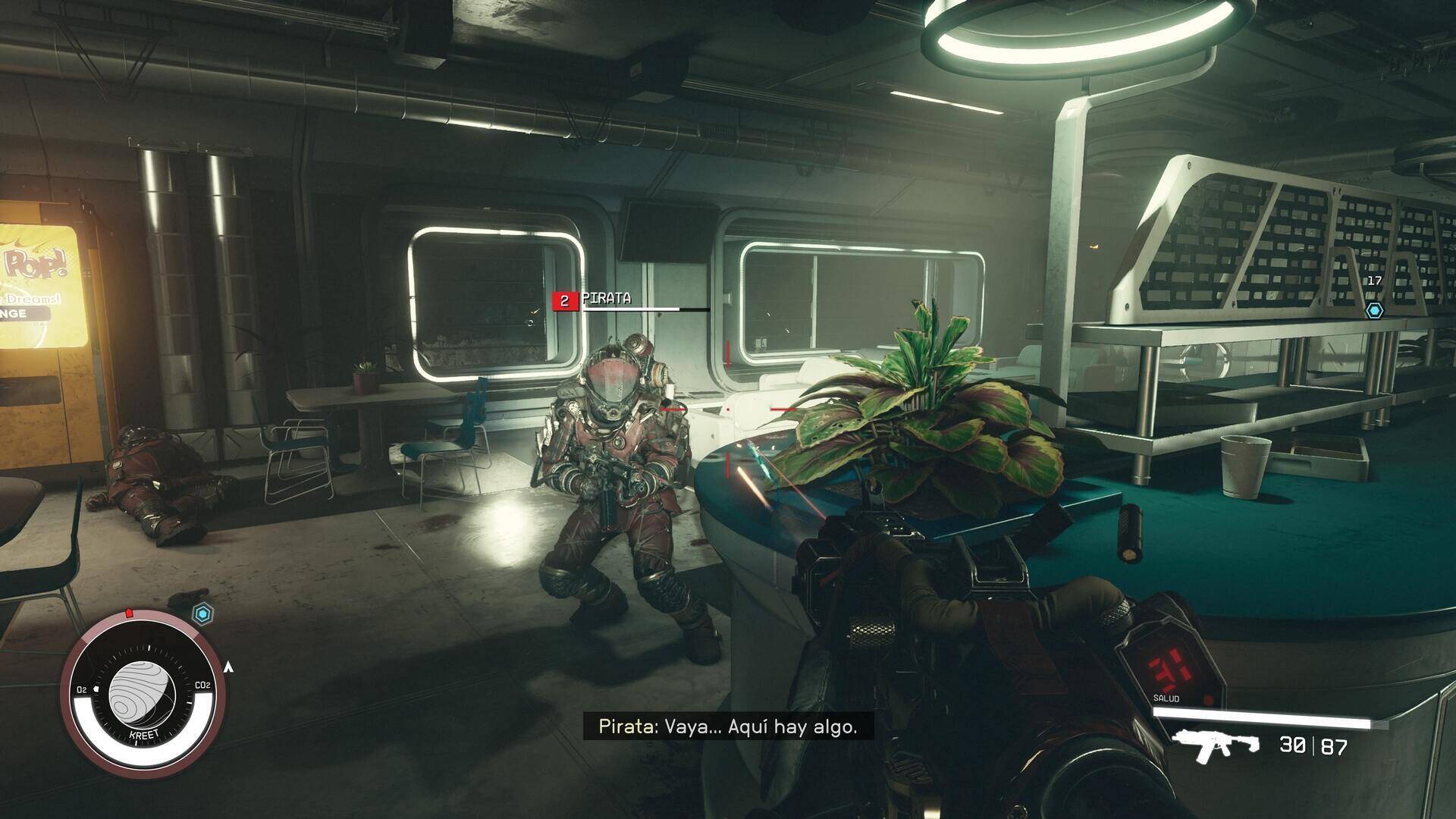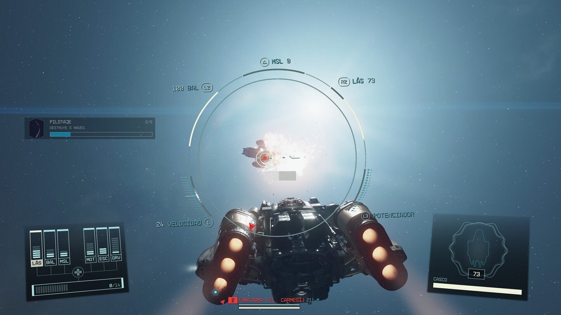 Una vez en el espacio exterior, podremos tomar control directo de la nave de manera manual y aquí es donde entra la mecánica del combate. El espacio no es un lugar seguro, está lleno de piratas espaciales que no dudarán en atacarnos y hacerse con nuestro botín. Es por ello que nuestra nave está equipada con armamento para poder hacerles frente y es en esta parte donde decimos que se siente desaprovechado, ya que hay poca variedad de afrontar un combate estelar, básicamente se resume en apuntar y disparar hasta que uno de los dos caiga. Tampoco hemos visto nada más que hacer en el espacio más allá de combatir, siendo al final un mero trámite para viajar entre planetas, aunque la experiencia se ve reforzada con la aparición de eventos espaciales, encuentros dinámicos y puntos de interés en órbita que aportan algo más de vida a la exploración espacial. A esto ayuda la implementación del «Modo Crucero» de la actualización Free Lanes, que permite un vuelo manual más libre entre cuerpos celestes, reduciendo la dependencia de los menús de salto rápido.