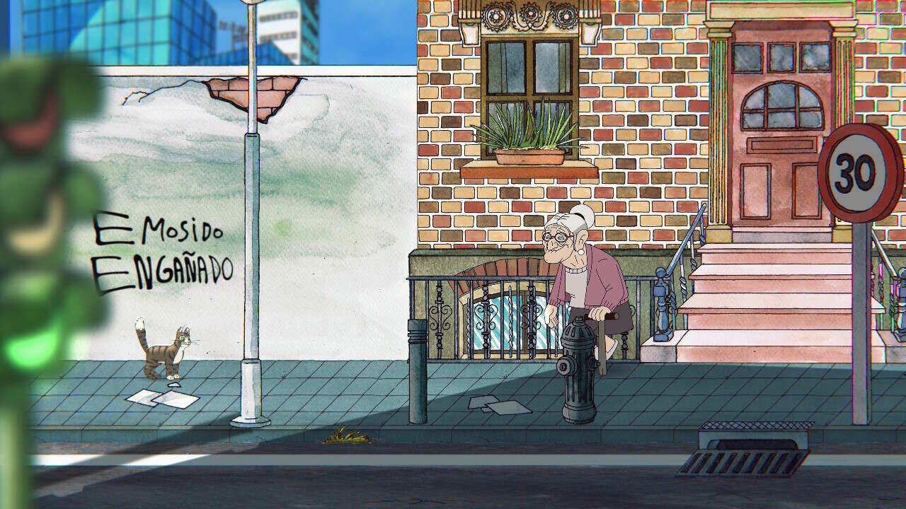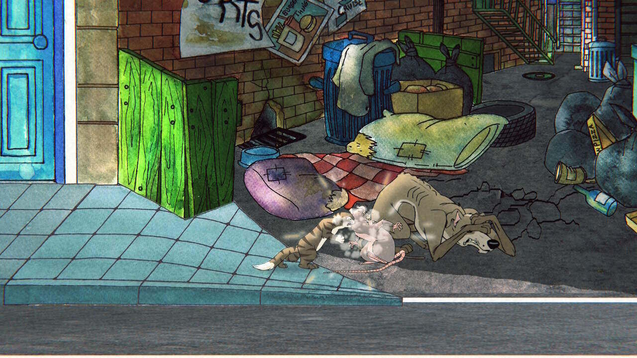 Donde Stars In The Trash destaca definitivamente es en su apartado artístico. El estilo visual, completamente dibujado a mano, recuerda a las películas clásicas de animación tradicional, con fondos que parecen pintados con acuarela y personajes con un gran diseño y bien dibujados. Cada animación está cuidada al detalle, y Moka transmite emociones constantemente a través de su lenguaje corporal, sin necesidad de una sola línea de diálogo. Es un trabajo artístico que no solo es bonito, sino coherente con lo que el juego nos quiere contar, reforzando ese tono entre tierno y melancólico que lo impregna todo, sobre todo a partir de cierto evento de la aventura. El apartado sonoro acompaña de manera excelente esta propuesta visual. La música es discreta, pero muy efectiva, entrando y saliendo según lo requiere cada situación. Los efectos de sonido, desde los maullidos hasta los ruidos del entorno, están bien integrados y ayudan a dar vida a un mundo que se siente orgánico.