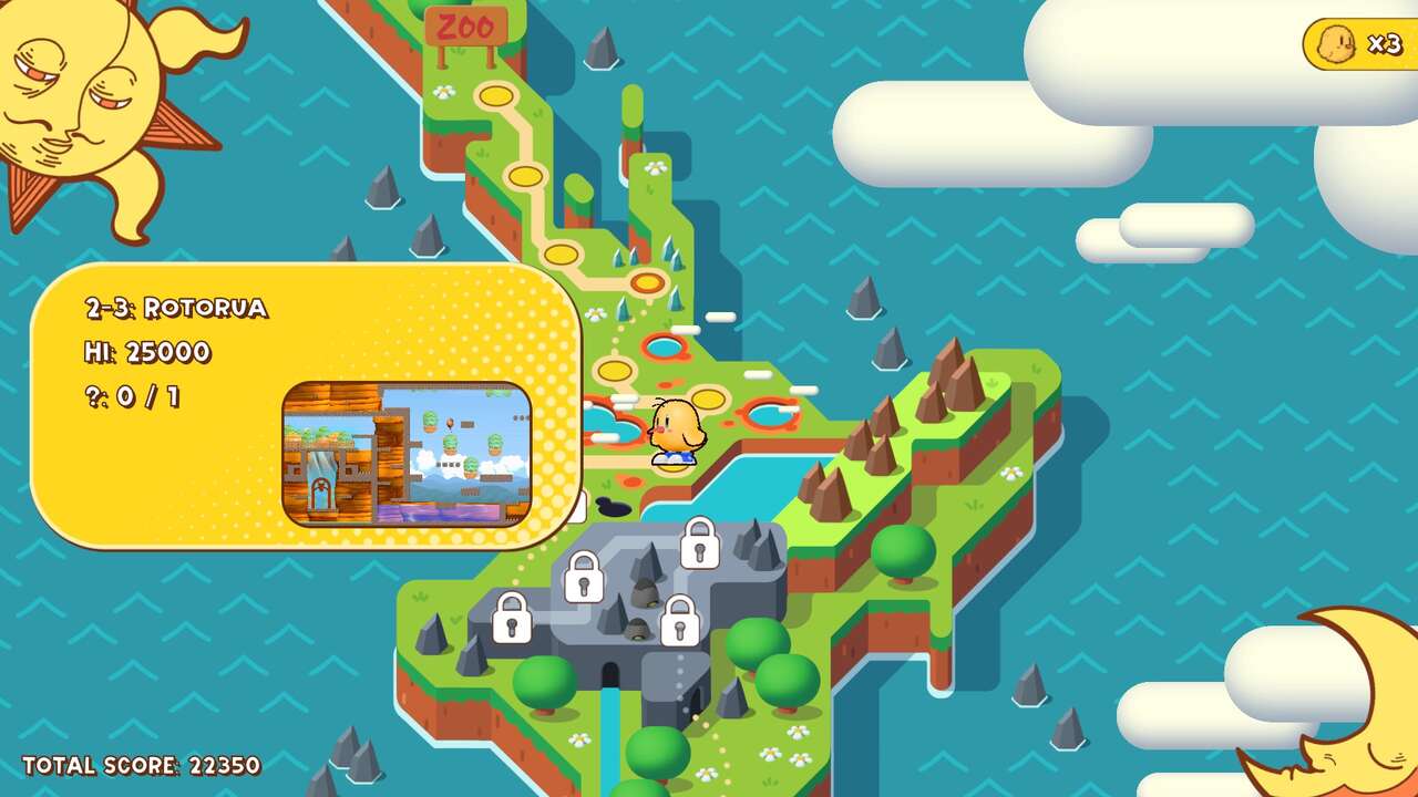 Y algo que el lector conocedor de The NewZealand Story habrá echado a faltar en este texto es no haber tocado el tema de las ‘warp zones’. Como habíamos dicho, el avance por los escenarios y niveles puede ser sota-caballo-rey. De la 1-1 a la 5-4, nivel por nivel. Pero podemos encontrar vórtices espaciales que nos llevarán tanto a subniveles externos, como conectarnos con distintas zonas reales, pudiendo avanzar en algunos casos distancias considerables, facilitando mucho el avance y reduciendo el tiempo de juego. Pues en The NewZealand Story: Untold Adventure, no solo están marcados con unas pequeñas chispas -en el original eran invisibles- debiendo también disparar sobre ellas para revelarlas, sino que en el mapa se guardan las que hayamos encontrado en cada nivel, potenciando un poquito más rejugailidad y revisitas. Sin ser la octava maravilla del mundo, logra de una forma extrañamente efectiva el querer volver y volver.