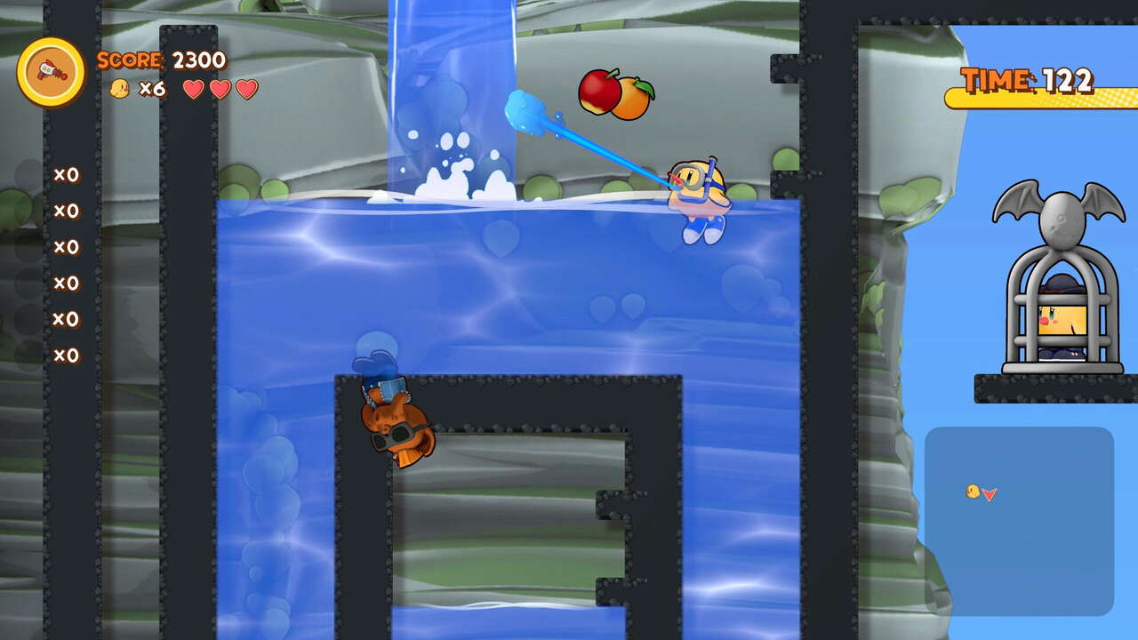 Las señas de identidad se siguen manteniendo: variedad en sus niveles, enemigos, elementos y escenarios. Una de las señas más clásicas es que Tiki coja globos, o cosas voladoras, para potenciar la movilidad, verticalidad y exploración, con distintas propiedades según el vehículo. Cada nivel es un pequeño laberinto, o ya mayor en el caso de Wellington y el Monte Cook. El camino puede ser más o menos lineal a priori, pero cada vez se irán ampliando los niveles, caminos y formas de llegar al cautivo de ese nivel. Tenemos un pequeño mapa para al menos, saber donde está el amigo prisionero. Pero ahora en este remake tenemos un mapa general, muy lineal, pero nos ofrece cierta información adicional para potenciar un poco la rejugabilidad.