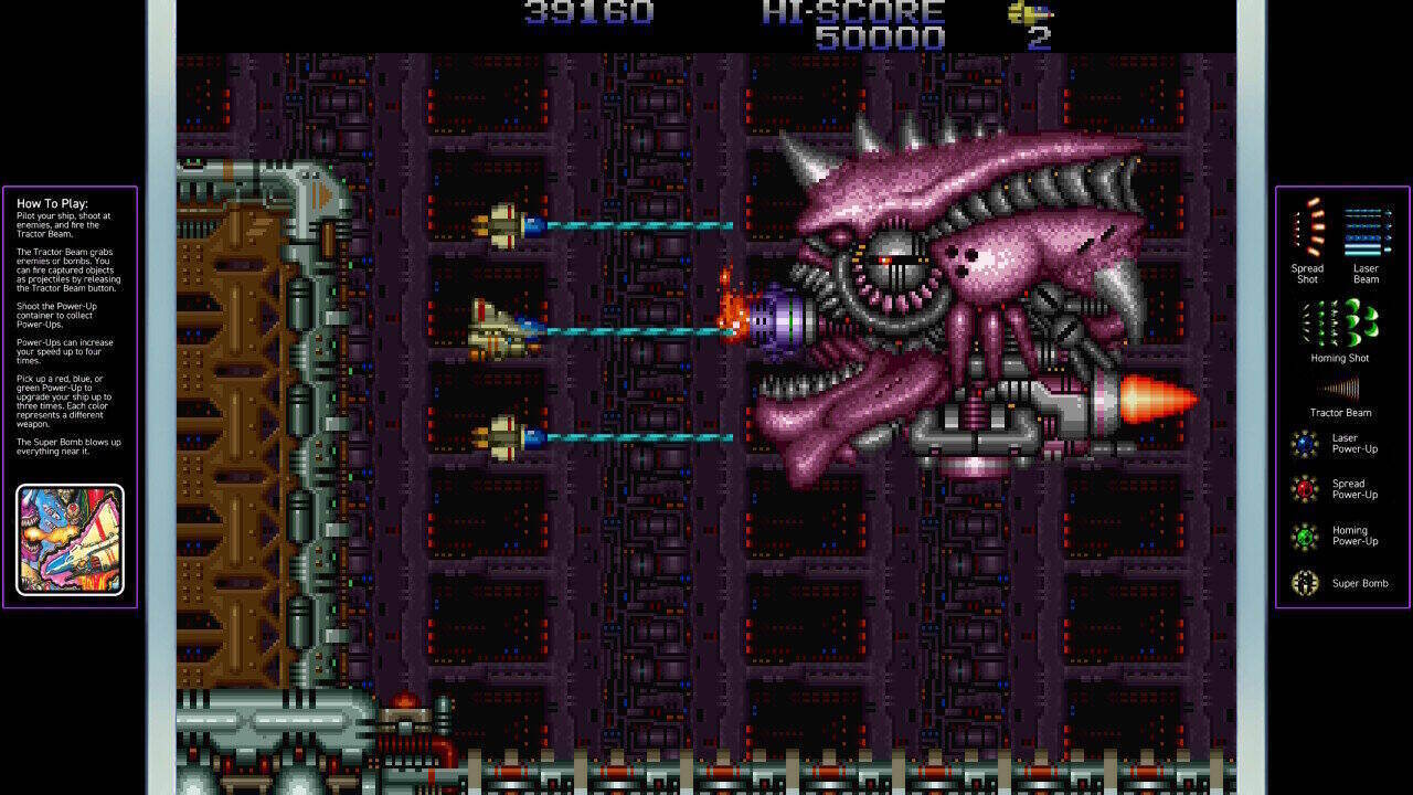 El primer juego que encontramos es Zero Wing (1989). Ya desde el arranque apreciamos que no estamos ante una simple continuación del estilo vertical más ortodoxo, el juego apuesta por un scroll horizontal dominado por una ambientación espacial y un formato más pausado en cuanto a ritmo, pero que compensa con un diseño de fases muy bien medido y enemigos que obligan a planificar cada paso. Además, incorpora cooperativo local y consigue que la experiencia funcione tanto en solitario como acompañado. Nos encontramos con un título que no busca exhibirse en lo más extremo, sino construir un ritmo y entorno sólidos, y en ese sentido cumple con creces. La acción es constante, la sensación de control es precisa y, a pesar de su dificultad, cada partida es bastante satisfactoria.