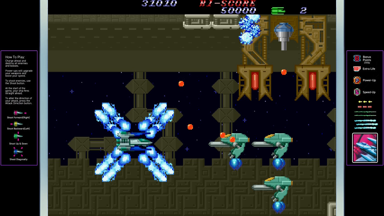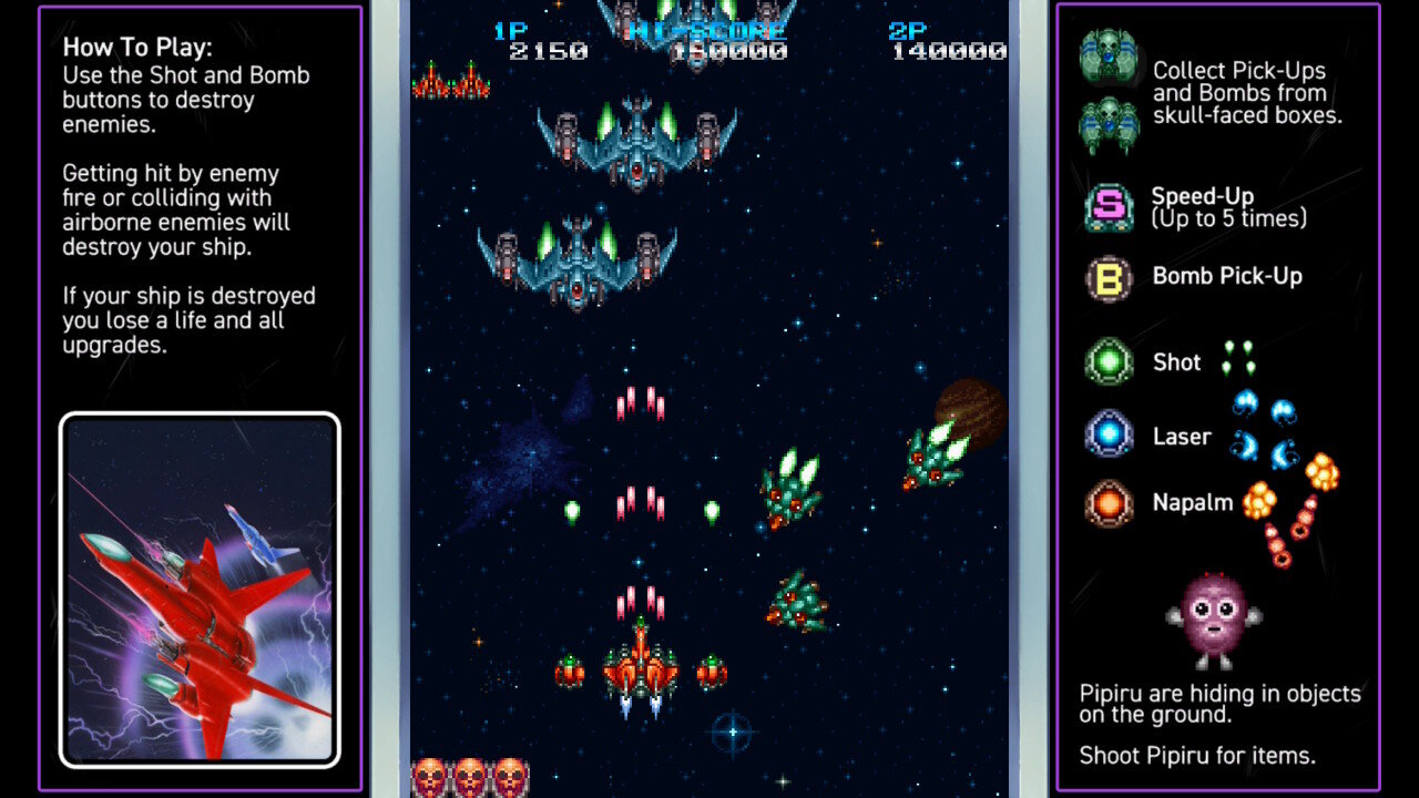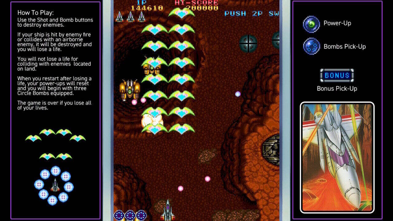 El mítico Truxton (1988) -o Tatsujin– es probablemente el más conocido del lote y con razón ya que representa a la perfección la esencia Toaplan. Este shooter vertical combina armas diferenciadas, jefes con ataques variados, escenarios bien diseñados y una curva de aprendizaje que nos invita a mejorar puntuaciones, dominar fases y sentir esa emoción y tensión arcade tan pura que caracteriza al estudio. Jugamos con una nave que responde con precisión, que se siente dinámica, y que nos mete de lleno en esa espiral de concentración y reflejos que define a los clásicos. Su ritmo es impecable, y sigue resultando tan adictivo hoy como lo fue en su lanzamiento original.