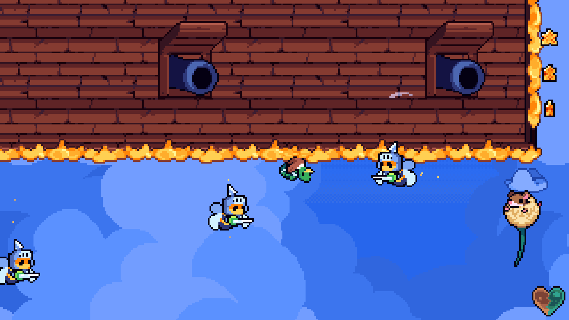 Una de las principales novedades de Windswept es que no existe un contador de vidas tradicional. Si un personaje cae o es golpeado por un enemigo, quedará atrapado en una burbuja, permitiéndonos continuar con el otro personaje hasta liberarlo. Esta mecánica puede limitar temporalmente la ejecución de ciertos combos y el acceso a coleccionables, lo que añade un elemento estratégico y de planificación a la experiencia. En las fases bonus, el juego nos permite volver a intentarlas o abandonarlas, conservando todos los progresos y objetos obtenidos hasta ese momento, lo que evita la frustración y recompensa la persistencia del jugador.