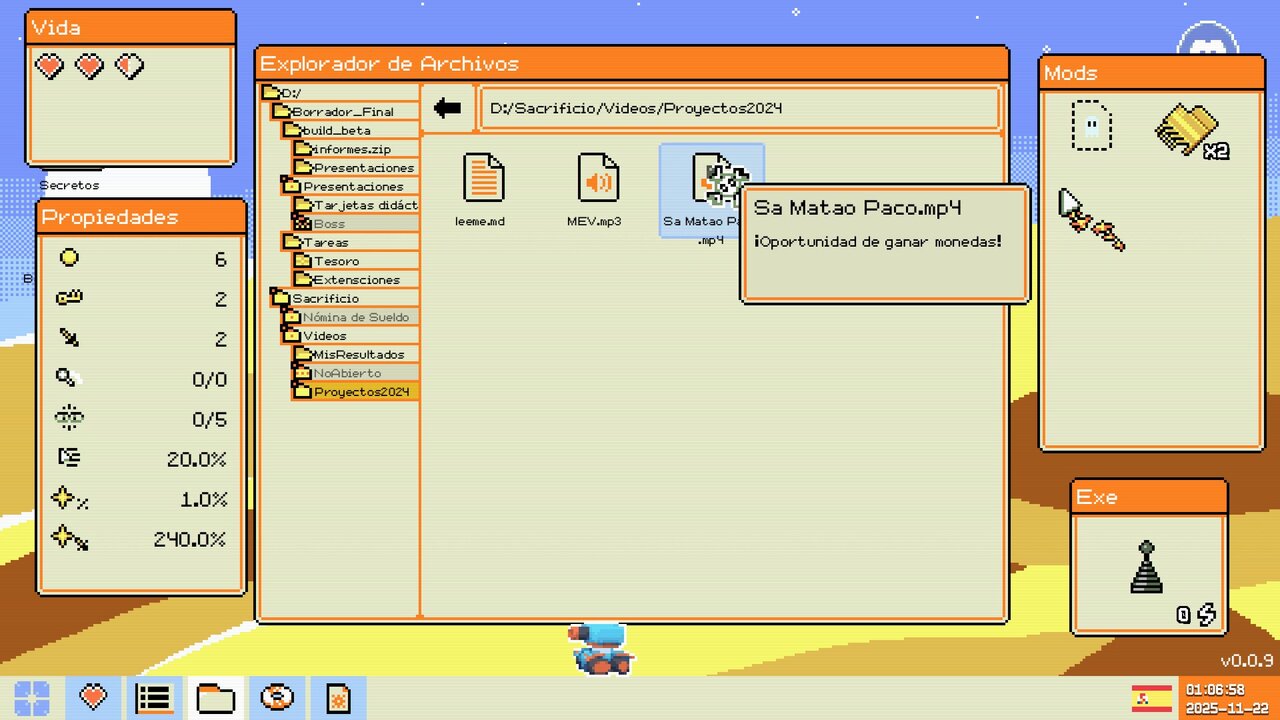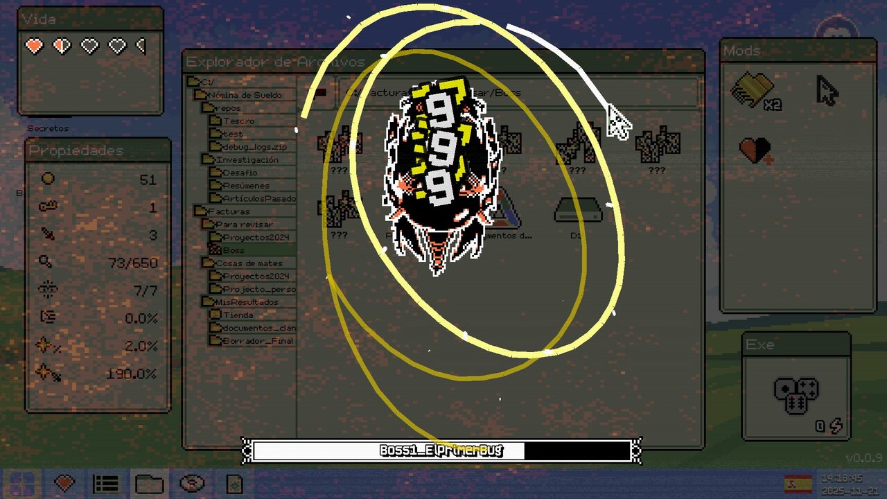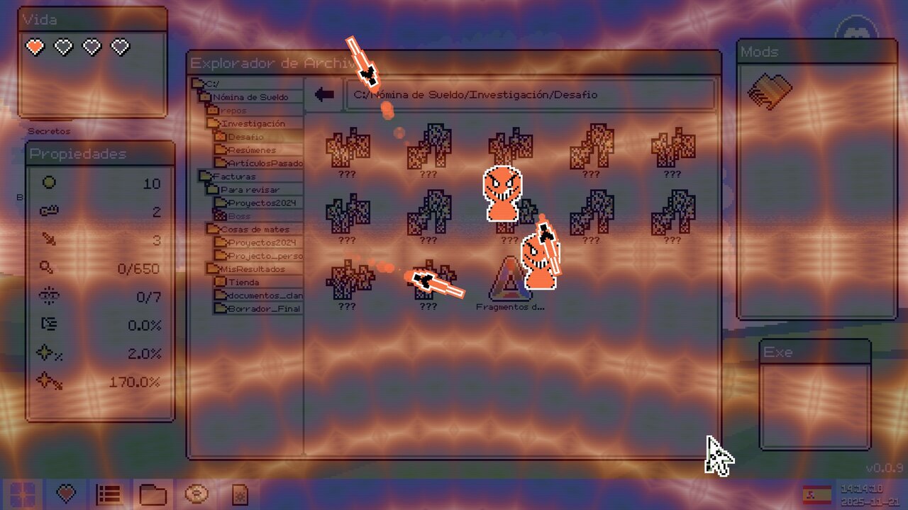 En lo visual, el juego utiliza el motor Godot y cumple sobradamente con su cometido. La interfaz simple recuerda mucho a un viejo PC con Windows 98, usando una paleta brillante que combina tonos fríos para carpetas, fondos y navegación, junto a tonos cálidos y más agresivos para señalar peligros. También se utilizan efectos estilo RGB que simulan una pantalla hackeada en estado crítico. Se nota un apartado cuidado: el malware tiene un estilo pixel-art de 16 bits muy detallado, y la forma en la que iconos, carpetas, ventanas y ficheros se convierten en auténticas “mazmorras” tipo dungeon crawler le da una personalidad muy marcada, como si explorar el disco duro fuera literalmente recorrer una mazmorra de D&D. Otro detalle simpático es que los enemigos parpadean, vibran o cambian de tonalidad para indicar ataques, y los cursores cuentan con efectos visuales propios muy diferenciados.