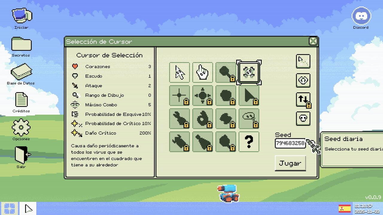 La mecánica principal del juego es la de un roguelite que combina elementos clásicos del género: exploración de ficheros como si fuesen mazmorras, combates contra jefes, botín y una fuerte presencia de bullet hell. Pero la cosa no se queda ahí. Los vampirelike nos han enseñado que cada personaje puede tener habilidades distintas, y aquí sucede algo similar, pero basado en nuestro puntero. Con el cursor básico, por ejemplo, tendremos que dibujar círculos alrededor de los virus para identificarlos, una mecánica que me ha recordado muchísimo a las capturas temporales de Pokémon Ranger. Cada cursor apuesta por una jugabilidad diferente: yo he usado mucho el cursor de selección, que causa daño periódico a todos los virus dentro del cuadrado que genera. Además, cada uno tiene sus propias estadísticas, y encontraremos otros bloqueados para los que habrá que completar misiones antes de poder usarlos. A día de hoy hay 12 cursores obtenibles de los 15 anunciados.
