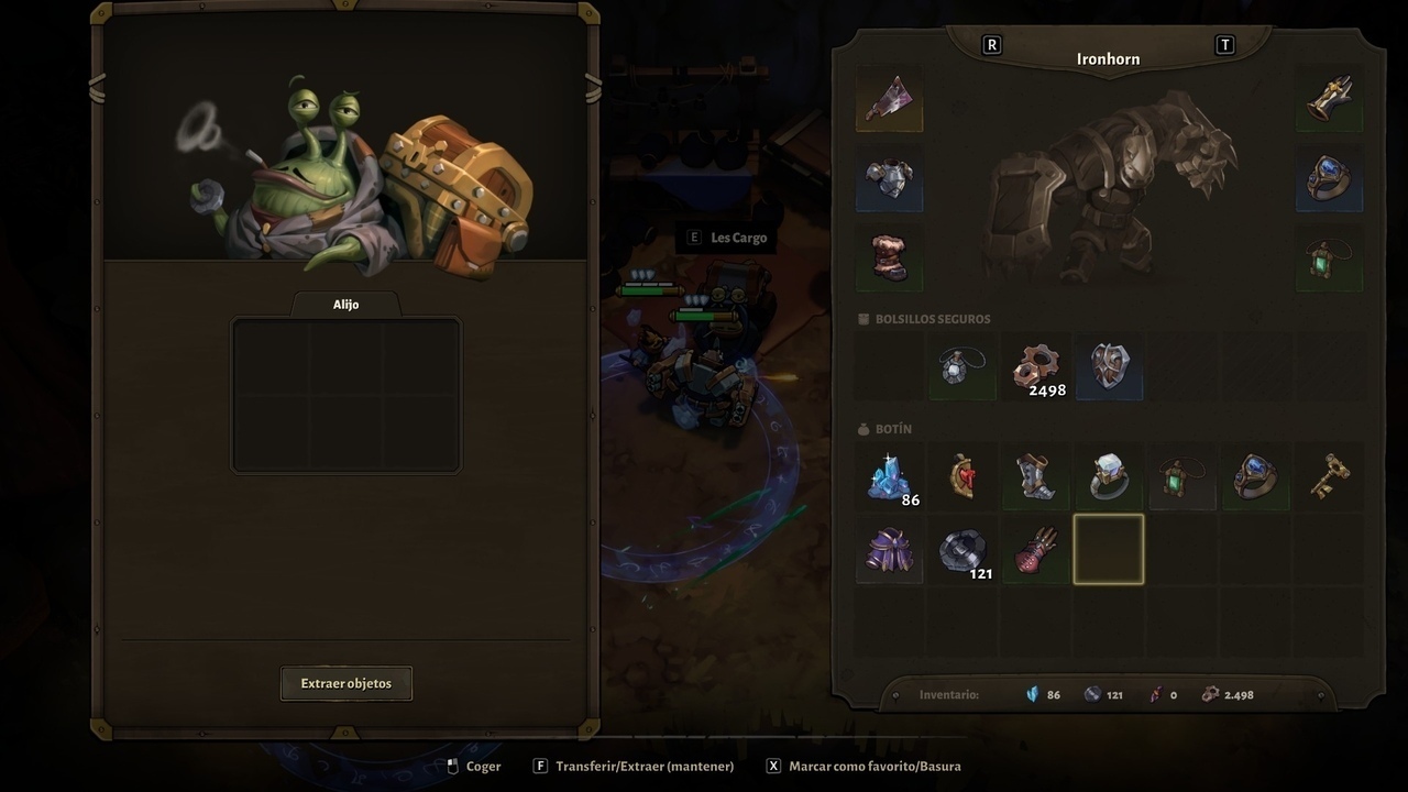Al completar un bioma, el juego nos ofrece dos opciones: continuar la incursión o extraer con todo lo obtenido. Siguiendo la tendencia de los extraction shooters, nuestro personaje cuenta con un par de bolsillos seguros, de modo que, si guardamos ahí objetos valiosos, deberían llegar intactos a la base. Y aquí entra en juego uno de los aspectos clave del título: la gestión del equipamiento. Vendiendo nuestro loot podremos desbloquear nuevos elixires o conseguir chatarra, la moneda del juego, que nos permitirá adquirir mejoras en el Liberador, nuestra base. Además, existe otro recurso llamado Cristalina, que sirve para mejorar las instalaciones. Todo esto refuerza su faceta de ARPG al estilo Diablo, ya que cada cierto tiempo obtendremos equipo mejor que el anterior, clasificado por rarezas que van desde común hasta legendario.