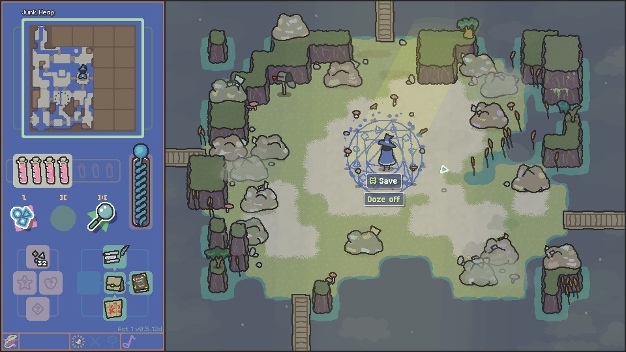 El control de Blue es exquisito, el personaje se mueve con agilidad y precisión, y cada acción resulta satisfactoria. El juego no nos lleva de la mano en ningún momento, pero tampoco lo necesita. Estamos ante un mundo interconectado en el que cada nueva habilidad abre rutas alternativas y nos invita a revisitar zonas conocidas, abrazando sin complejos el backtracking clásico. A pesar de contar solo con seis hechizos en este primer acto, el diseño de escenarios es compacto y muy bien medido; cada pantalla tiene un propósito claro y rara vez se siente vacía. Scrabdackle confía plenamente en la inteligencia del jugador y premia la experimentación constante: probar a usar magia en lugares inesperados casi siempre tiene recompensa, ya sea en forma de secretos, fragmentos de lore o ítems realmente útiles.