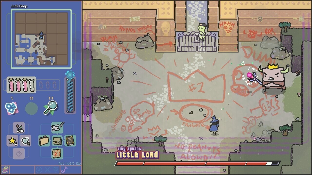 A nivel visual, Scrabdackle apuesta por un estilo dibujado a mano que imita el trazo de un rotulador sobre un cuaderno. Puede resultar feísta a primera vista, pero en el buen sentido: es claro, expresivo y rebosa personalidad. El juego no explica demasiadas cosas de inicio, ni siquiera detalles de la interfaz, como la mochila y el minimapa situados en el margen izquierdo de la pantalla, algo que descubrimos explorando y tocándolo todo. Esta filosofía de aprendizaje orgánico puede resultar abrumadora al principio, especialmente en portátil. En mi caso, jugarlo en Steam Deck fue más confuso de lo esperado hasta entender bien la interfaz, aunque el título está perfectamente adaptado al mando. Aun así, recomiendo jugarlo con teclado y ratón, donde el control se siente especialmente suave y preciso.